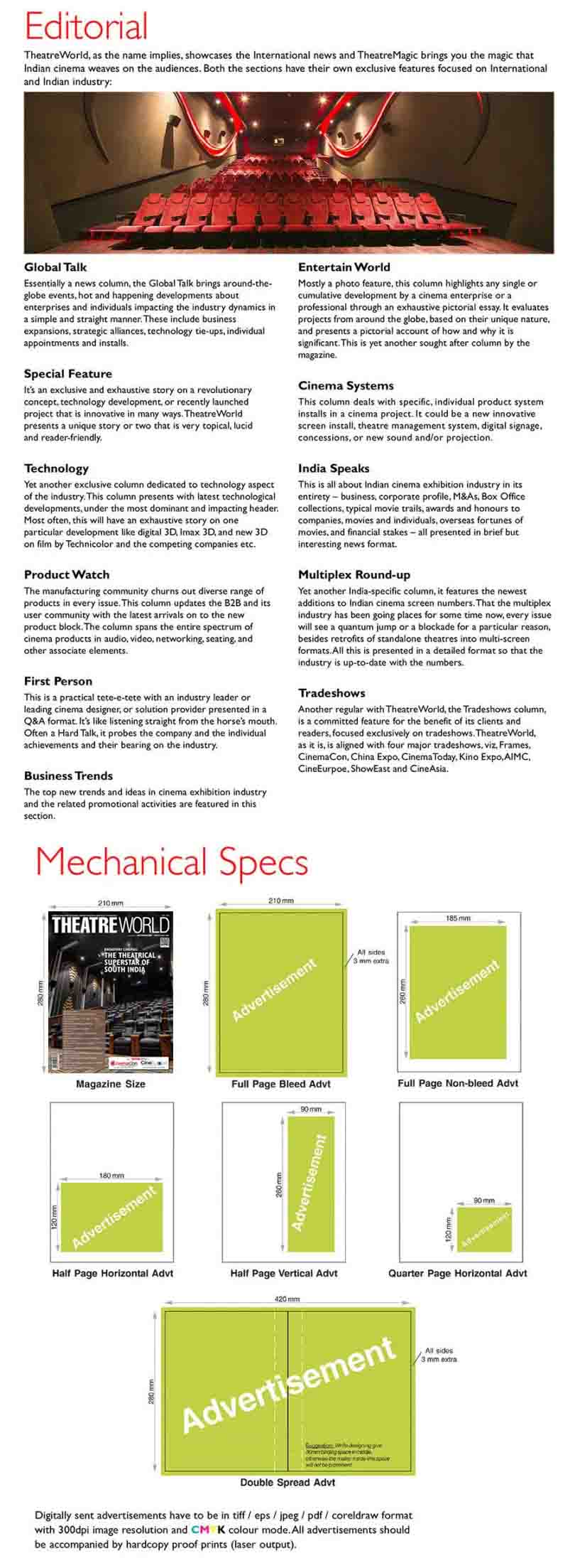 The only magazine of its kind, TheatreWorld is renowned the world over with unique brand equity, which is a collector’s guide a reference guide to readers. Be a part of the magazine that helps your brand and product establish itself in the world Cinema Market. Be a part of the magazine to become apart of the Global Cinema Industry.