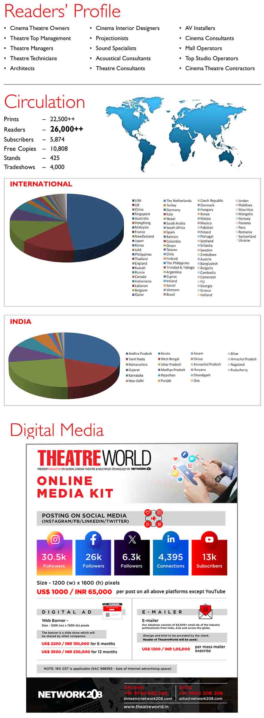 The magazine has witnessed the transformation from Film-reel Cinema to Digital Cinema. It is strongly focused on Multiplexes and Single Screen cinema theatre market with international reach.